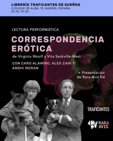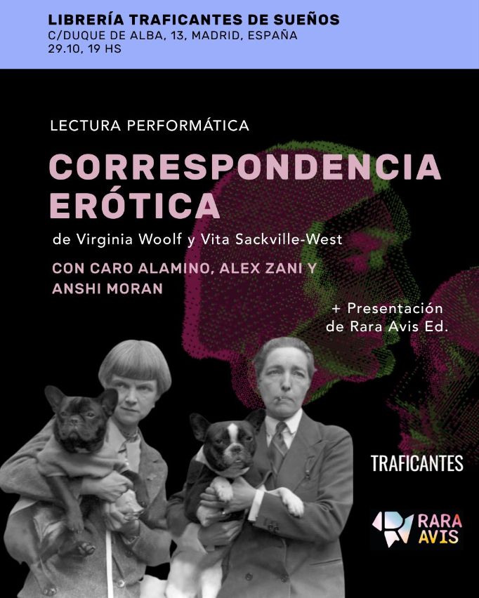 Presentaremos el libro Correspondencia erótica de Virginia Woolf y Vita Sack-Ville West (Rara Avis editorial) con una lectura de las cartas realizada por las poetas y artistas Alex Zani y Caro Alamino; ambas de Argentina residiendo en Madrid.