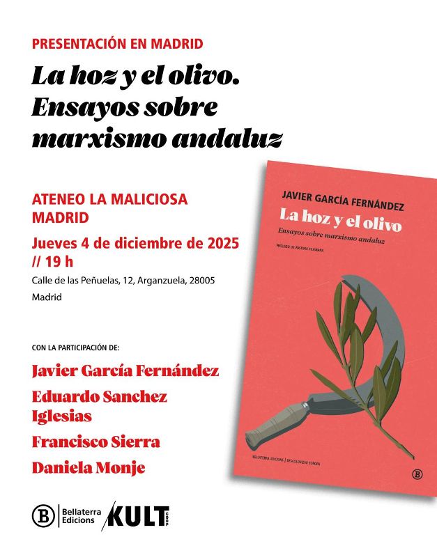 Presentación del libro La hoz y el olivo (Bellaterra, 2025). Con Con Eduardo Sanchez Iglesias, Director de la Fundación de Investigaciones Marxistas; Francisco Sierra, Diputado de IU/Sumar por Sevilla. Javier García Fernández, Historiador y Sociólogo UEM, autor del libro; Daniela Monje, Investigadora de la Universidad de Sevilla.