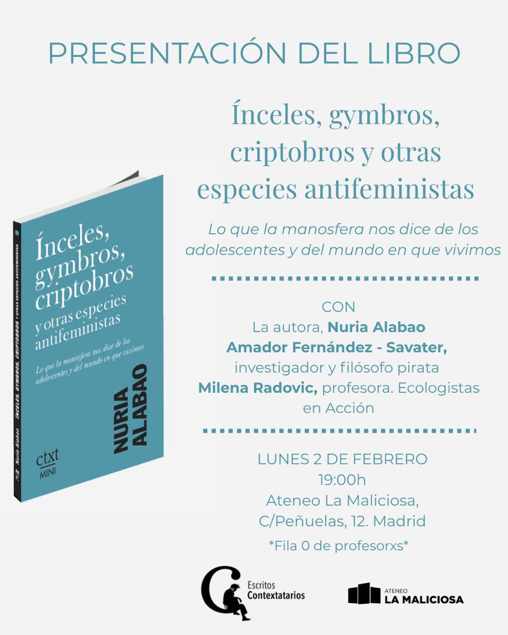 Presentación del libro Ínceles, gymbros, criptobros y otras especies antifeministas. Con Nuria Albao, autora, Amador Fernández Savater (filósofo e investigador) y Milena Radovic (profesora, Ecologistas en Acción).
