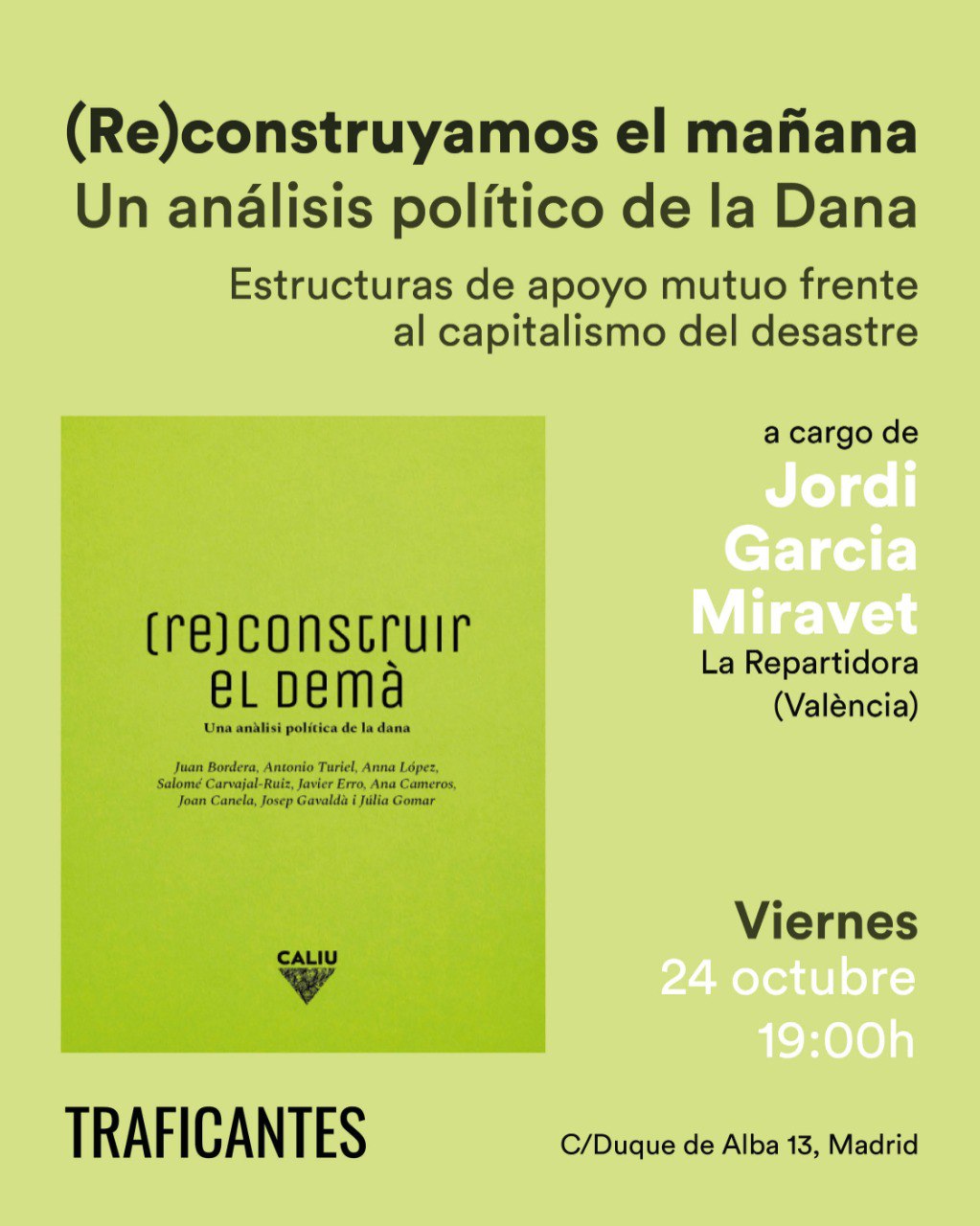 Presentación del libro (Re)construïm el demà. Una anàlisis política de la dana, y discusión en torno a las preguntas planteadas en el mismo: ¿en qué sentido la DANA no ha sido "una catástrofe natural"? ¿Cuál ha sido su impacto sobre economías y vidas concretas? ¿A qué capas sociales ha afectado especialmente? ¿Qué enseñanzas y desafíos cabe compartir desde la respuesta de autoorganización popular y el proceso de reconstrucción realizado más allá de las instituciones del Estado?